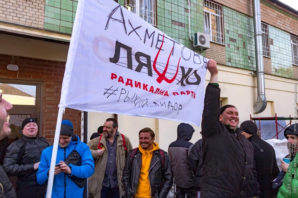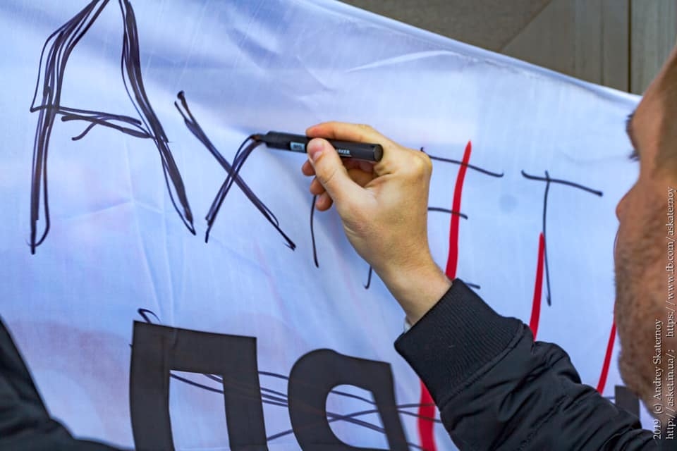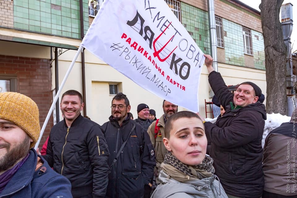 Через те, що акція на підтримку Супрун була заявлена організаторами як неполітична, без партійної символіки, «Демократичній Сокирі» довелося виступити без звичних багряних знамен із перехрещеними сокирами. Це, вочовидь, збентежило чутливу натуру нашого Начальника геніального штабу, відомого волонтера Serg Marco, який раптом зник на декілька хвилин, а після того повернувся вже із трофеєм – ворожим прапором партії Ляшка, який було швидко дороблено за допомогою маркерів – тепер прапор відображав і прізвище справжнього власника «радикалів» – олігарха Рината Ахметова – і відому тезу, яка підкреслює деякі фізіологічні особливості олігарха.