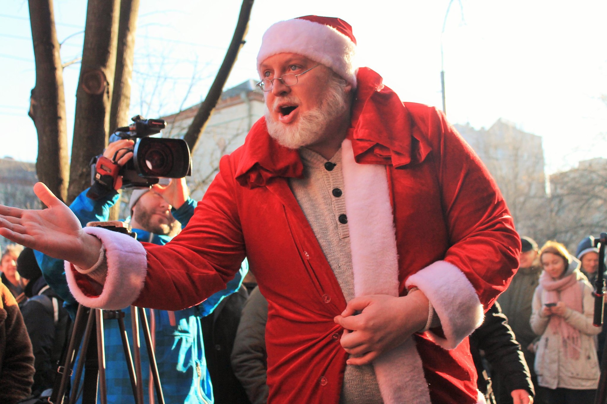 Сьогодні ж День святого Миколая і ми не хочемо, щоб хтось залишився без подарунків. Під керівництвом Гудименка натовп «демсокирян» почав скандувати «выходи, выходи, выходи». І він нас все-таки почув. Крізь натовп протестувальників на площу перед судом ввірвався несвятий Коломой. Ігор Валерійович прийшов, привітався з усіма, побалакав з народом та роздав кілька десятків запрошень «попить кофе». Але надовго несвятий Коломой не затримався та швидко пішов у невідомому напрямку – може, під Нацбанку до своїх чортиків, а, може, взагалі на Кіпрі, хто його зна…