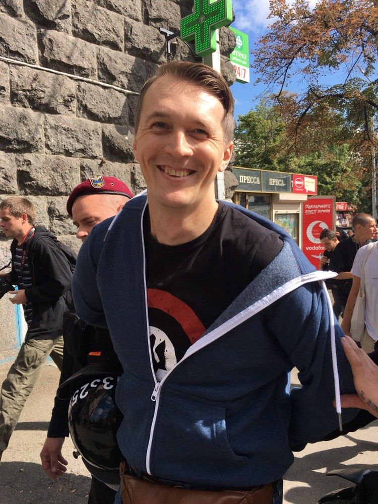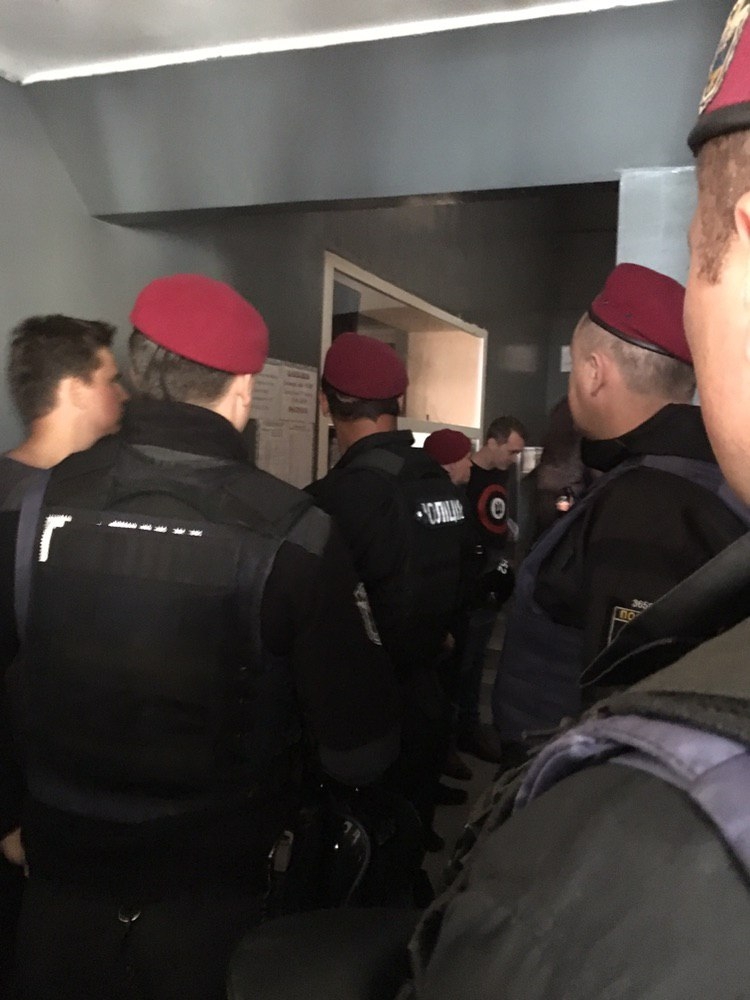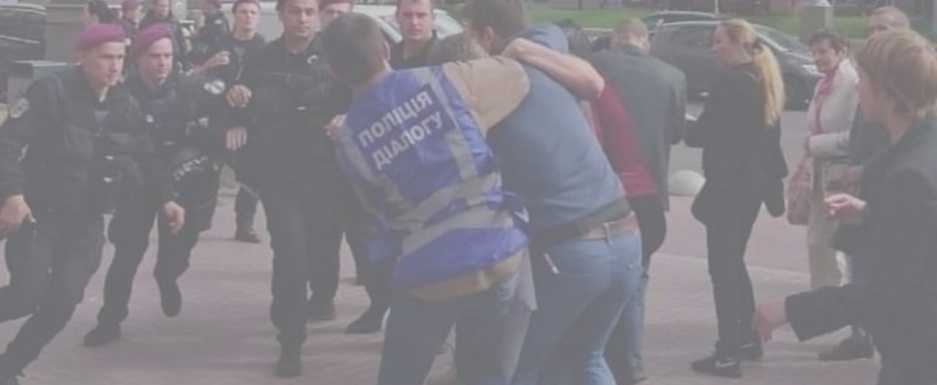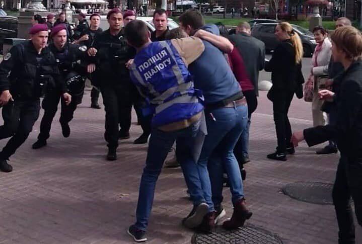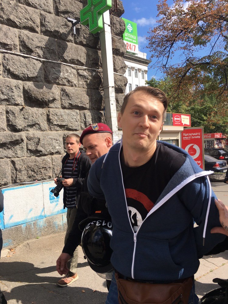 А ось тут, як казав смертний простолюдин із сусідньої країни, наберіть повні легені повітря. Починається найцікавіще. Один із симпатизерів NewsOne розгорнув плакат із нецензурними висловлюванням щодо нашої партії, що повністю суперечили всі нормам літературної української мови. Юрій Гудименко, який українізується щохвилини, вирішив зробити цьому парубку зауваження, що швидко переросло в діалог із активною артикуляцією та жестикуляцією. У результаті полеміки між Юрієм та якимось чортом з’явились доблесні представники поліції, які без жодних пояснень і тим паче без показу своїх документів, розпочали доставку нашого вождя до відділку поліції. За словами самого Юрія, доставка була не найзручнішою. «Останній раз таке було за часів Януковича. Якось я призабув відчуття заламаних рук…», - зауважив Гудименко.