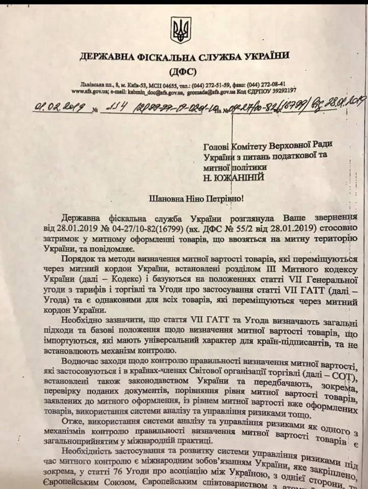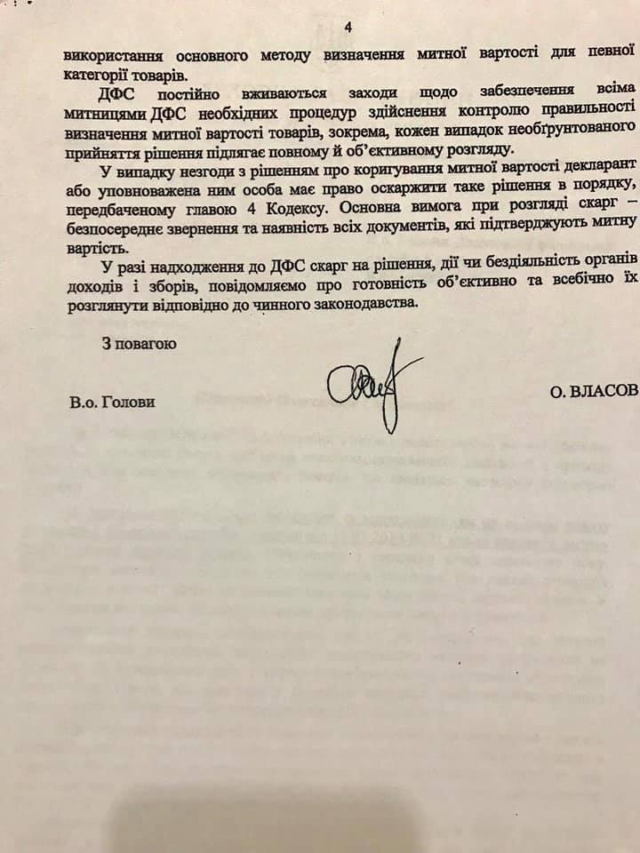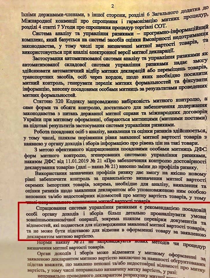 На фото майже два аркуші формату А4: нам просто передрукували нашу внутрішню і міжнародну нормативку з розмитнення. І нагадали (спасибі, звичайно), що ми повинні дотримуватися міжнародних договорів, які підписали. Дякую, пане Власов, бо ж ми 10 років імпортуємо і не знали цієї нормативки. Але то нехай. Далі пан Власов таки визнає, що 11.01.2019 року підписав наказ ДФС «Про забезпечення контролю достовірності декларування товарів» №21, яким внесли зміни в профілі ризиків (так раніше називалися індикативні ціни). Пан Власов нам ще пише, цитую: «Спрацювання системи управління ризиками є рекомендацією посадовій особі органу доходів і зборів більш детально проаналізувати умови зовнішньоекономічної операції».