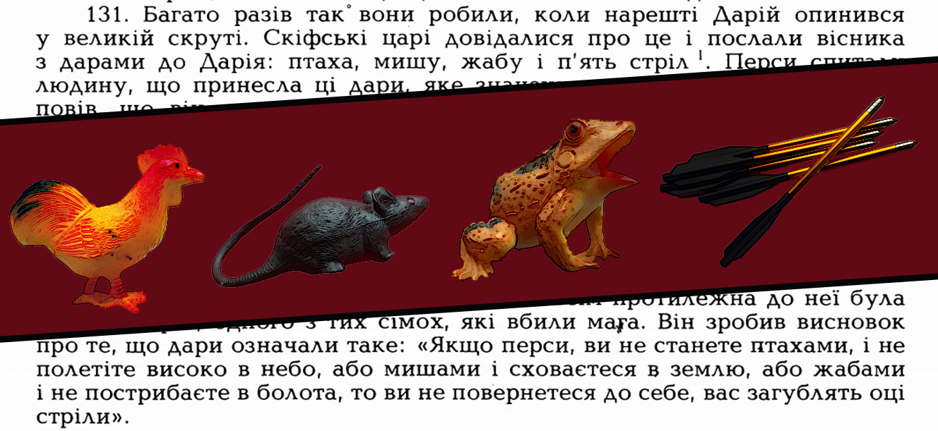 Відтак, «Демократична Сокира», невпинно працюючи над посиленням незалежності українських інституцій від стороннього впливу, в конкретному випадку – від впливу Коломойського на Трубу і ДБР за посередництвом Портнова, задля забезпечення фінансової стабільності України та відновлення її репутації на міжнародному рівні, оголошує джихад Державному бюро розслідувань, їхньому формальному очільнику Роману Трубі та Андрію Портнову. Будуть акції, будуть заяви, буде тиск і буде пекло – все, як ми любимо. А щоб Роман Труба не казав, що ми напали «вєроломно і бєз обьявлєнія войни», ми попередили його, як свого часу скіфи попередили царя персів (не котів) Дарія І. Ми надіслали Трубі на день народження птаху, мишу, жабу та п‘ять стріл. У скіфів це попередження значило щось на кшталт «якщо ти не полетиш на небо, наче птах, не сховаєшся під землю, як миша, і не забереш, жаба, із собою свою гадюку Портнова, ми прийдемо по вас і зробимо ататат». А підозрюючи, що у Труби радники не настільки розумні, як у царя Дарія, ми додали і том Геродота, де описується ця легенда. Сподіваємось, читати він вміє.